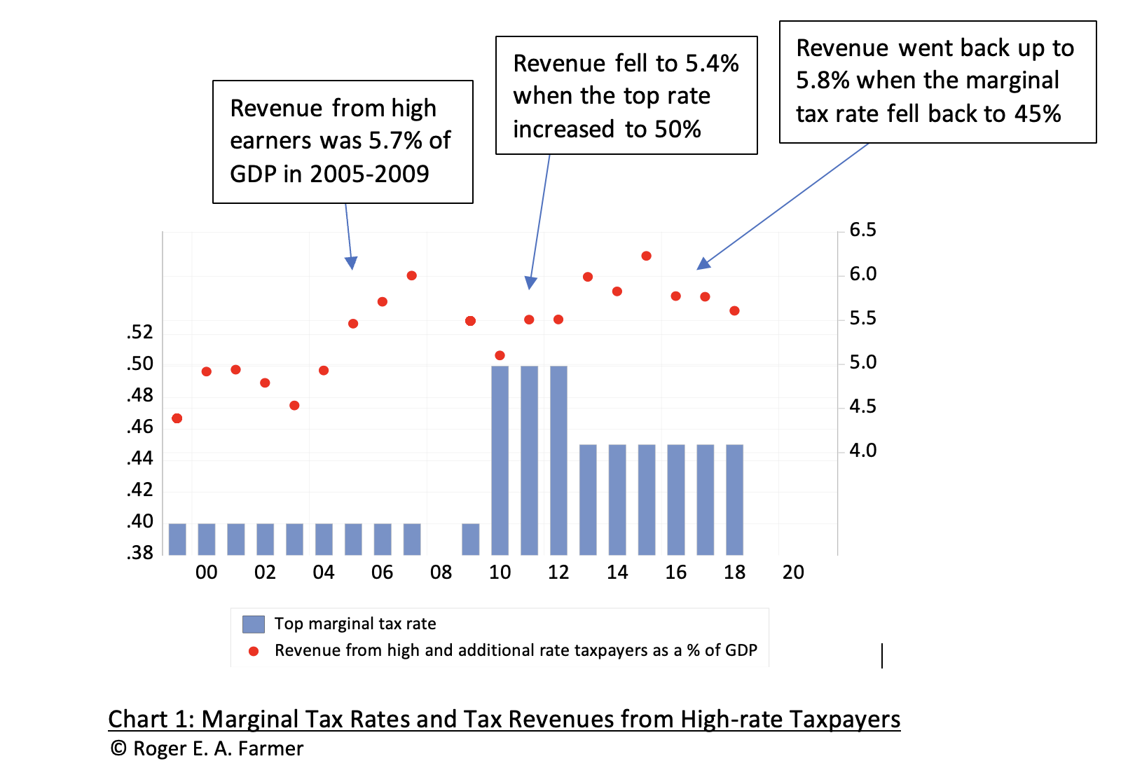 Revenue from high earners in the five years from 2005-2009, before the Osborne experiment, was on average equal to 5.7% of GDP. In the three years from 2010 to 2012, when the top tax rate was 50%, revenues from high-rate taxpayers fell to 5.4% and when the tax rate fell back to 45% in 2013, revenues picked up again to 5.8%, roughly the same as in the earlier period.
